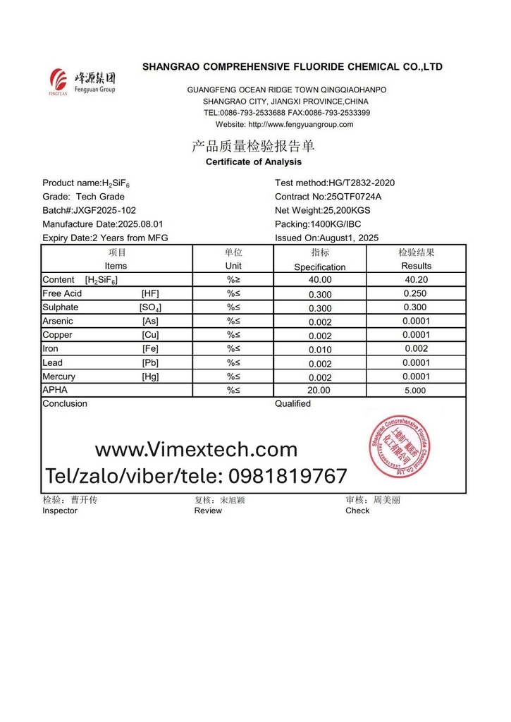 | Nồng độ H₂SiF₆ | Nước muối điện từ fluorosilicate chì được dùng; nồng độ tổng thể khoảng 20-25% |