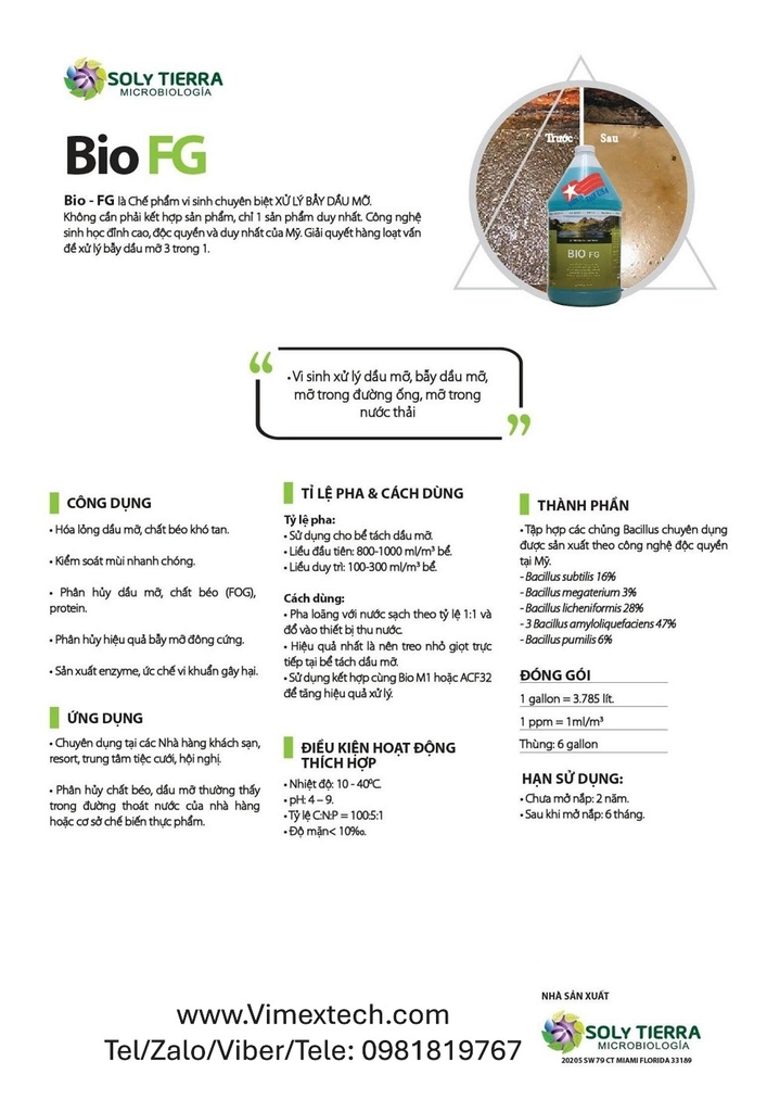 - Bio FG: 300 ml/m³ bể tách mỡ