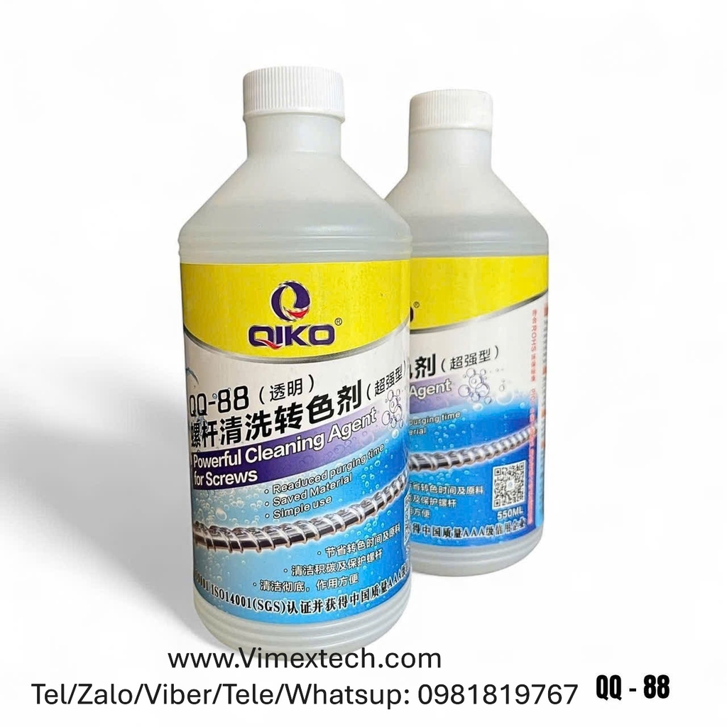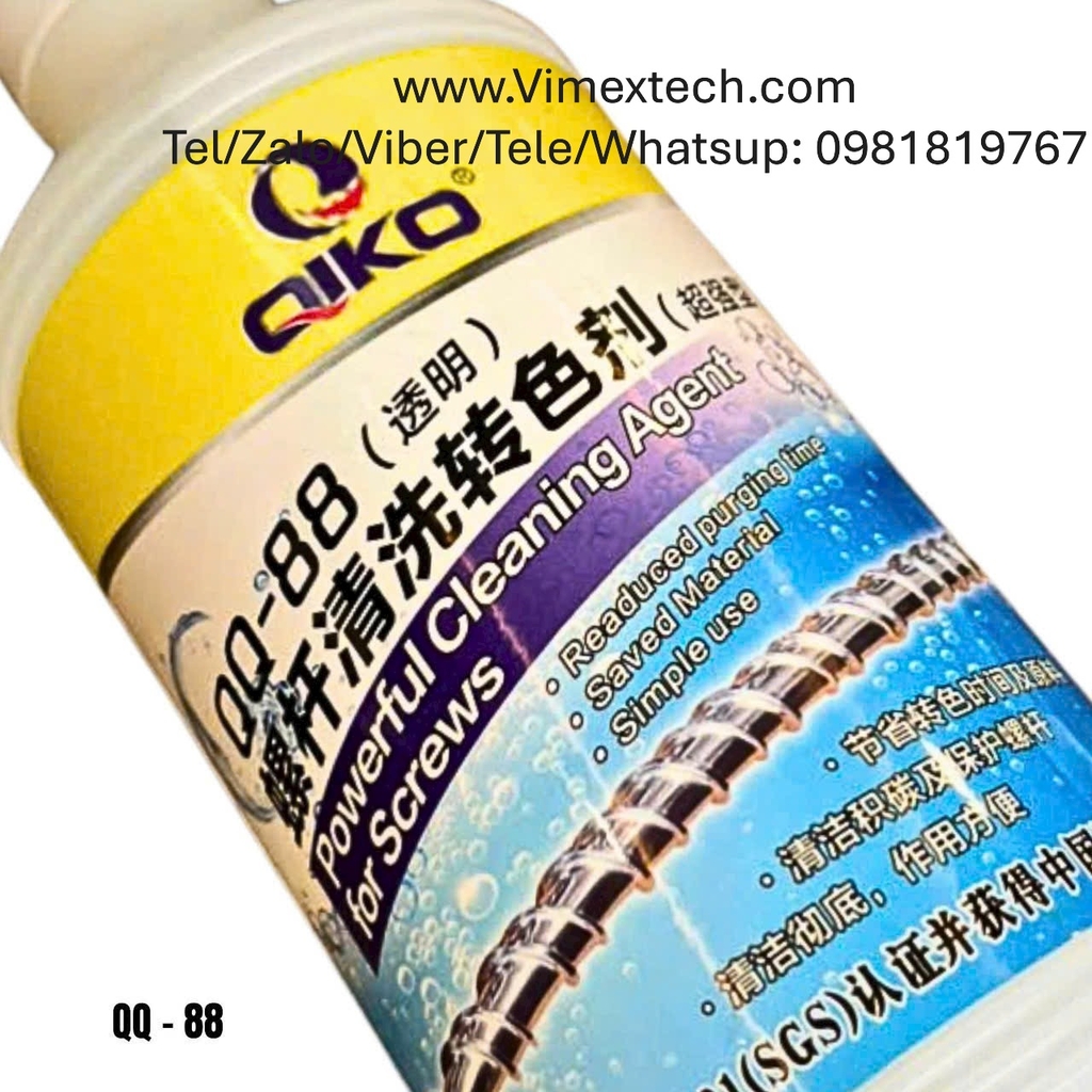 Là một purging compound "xanh" (green formulation), QQ-88 dựa trên nguyên liệu nhập khẩu, không chứa hóa chất ăn mòn mạnh (non-corrosive), pH trung tính đến hơi kiềm (khoảng 7-9), an toàn cho kim loại vít (thép hợp kim) và không để lại cặn ảnh hưởng đến mẻ sản xuất sau. Thành phần chính là hỗn hợp hữu cơ, với cơ chế làm sạch kép: cơ học (mechanical scouring) và hóa học (chemical reaction).