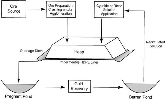 Sau đó các đống lớn sẽ được phun dung dịch rửa trôi, qua đó dung dịch chứa vàng sẽ được rửa trôi ra khỏi đống. Chất lỏng mang Au dung dịch sẽ chảy vào bể dung dịch chứa Au. Sau đó, sử dụng phương pháp xử lý quặng vàng hấp phụ than hoạt tính, thiết bị dịch chuyển bột kẽm, v.v. để tách vàng ra khỏi chất lỏng. Chất lỏng đuôi sẽ được tái chế.
